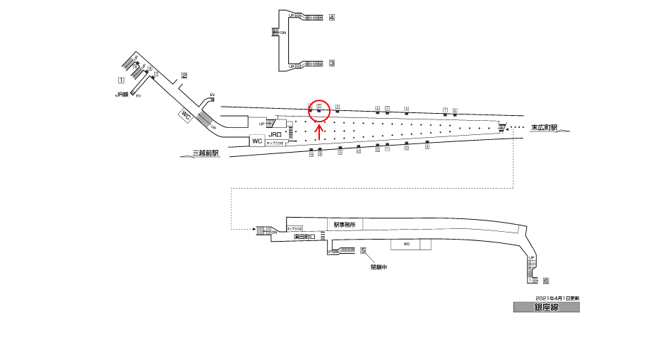 サインボード「銀座線 神田駅 №2」はホーム端、1~4番出口方面の改札寄りにございます。(JR乗り換え側)