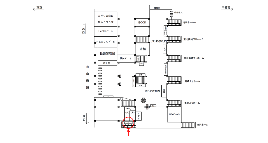 ○幹南改札付近№821 改札内コンコース(埼京線 ホーム階段正面) |