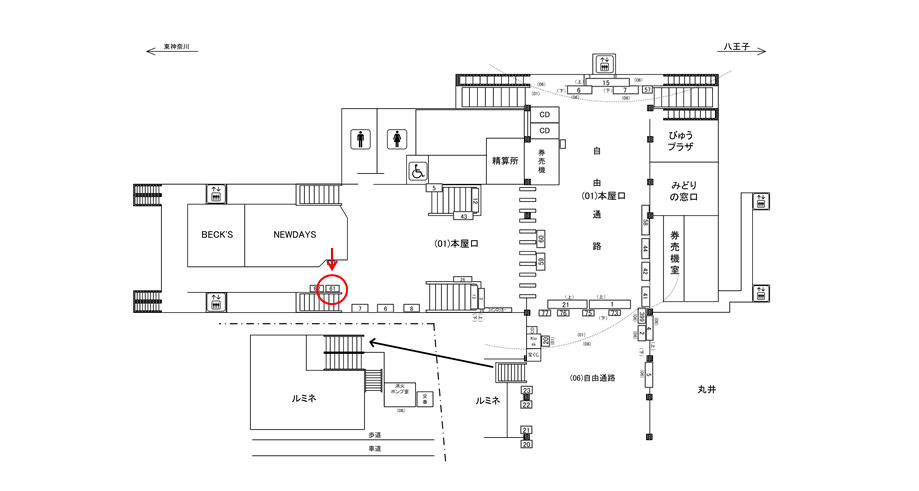 中央改札内のコンコース通路の構内駅面に設置された広告看板です。JR横浜線と中央改札をつなぐ通路上です。1.8m×24mと構内の中でも広告面の大きい看板で、駅構内を往来される方へ強く印象付ける広告をお考えのお客様に有効です。
