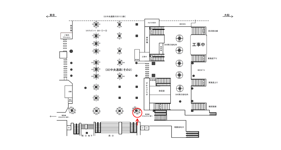 JR横浜駅、東西自由通路(中央通路)の柱に設置された広告看板です。西口側寄りの柱面にございます。