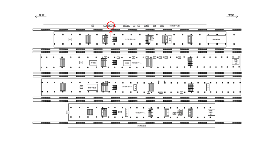 改札は北改札口と南改札口の地上2箇所、ホームは高架上層階に島ホーム4面(京浜東北線上下/宇都宮線・高崎線・上野東京ライン/宇都宮線・高崎線・湘南新宿ライン/埼京線の各ホーム)ございます。北口改札外は東西に抜けており、バス利用者や駅周辺を行き交う方々の自由通路としても機能しています。