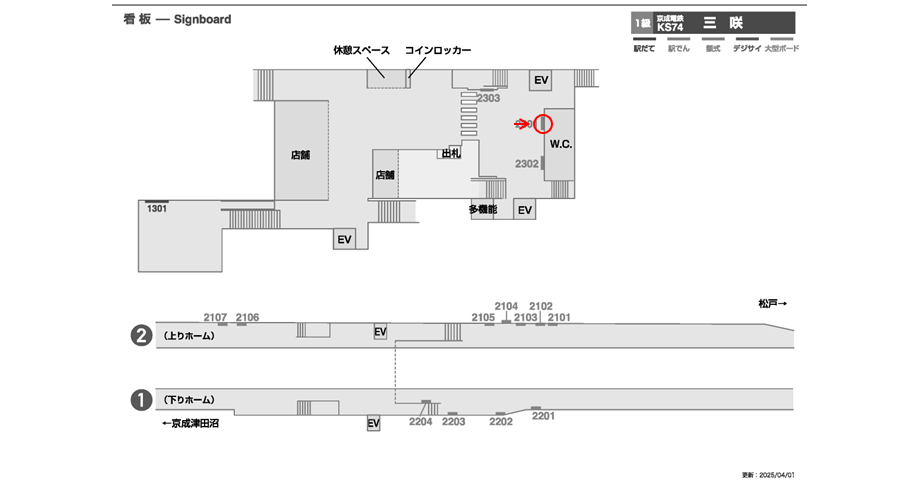 自動改札機正面の壁面上部に位置しており、駅利用者の多くが目の前を往来する環境にあります。手前の標識が一部重なるため遠めからはデザイン上部が見えにくくなります。現地のご確認をおすすめ致します。