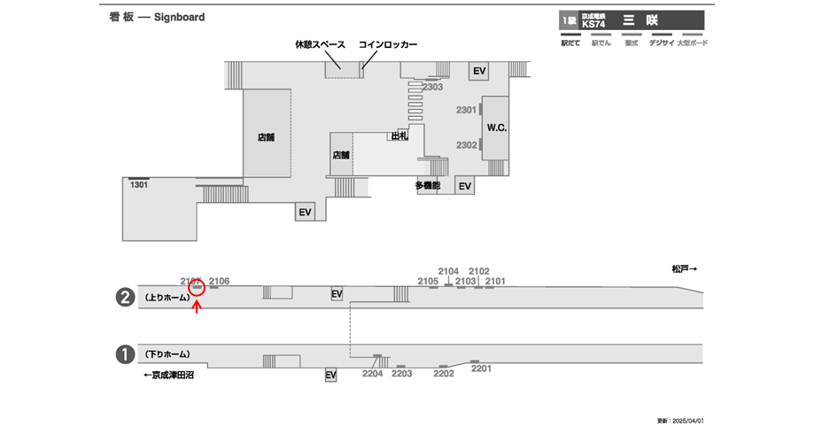ホーム上の新津田沼駅寄りに位置しており、上り線利用者はもちろん、反対ホームに立った時も看板に対し正対します。