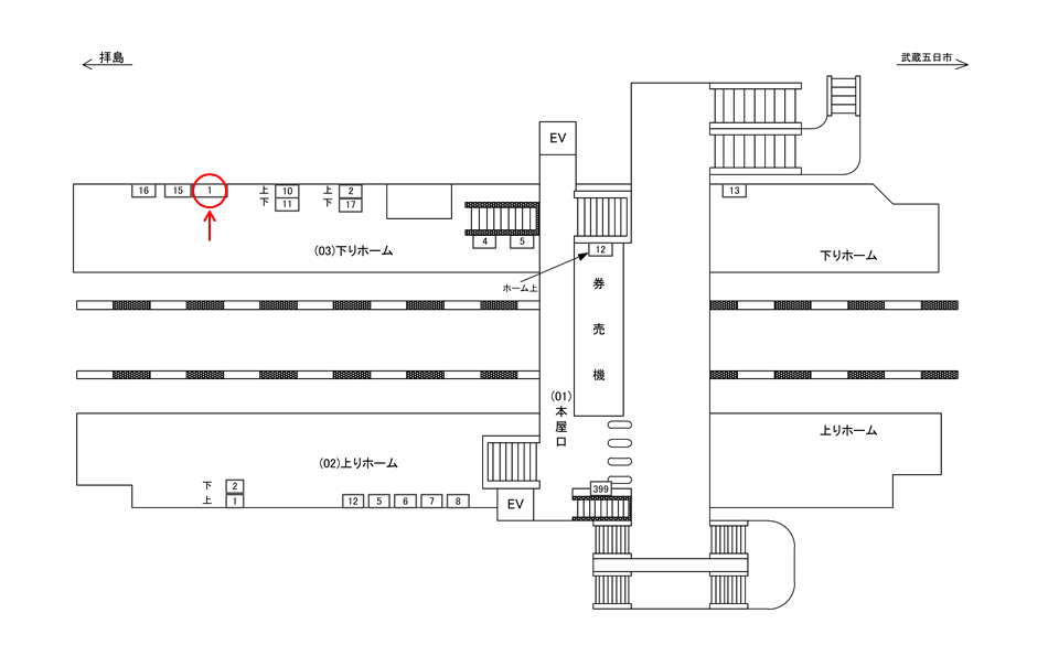 ※この看板「JR 秋川駅 上りホーム№2」は看板位置が高いところにあり、立川方面へ向かう方には見えづらい看板位置となりますのでご注意ください。