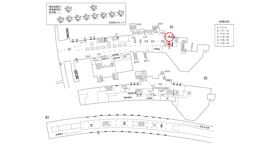 駅構内にある駅看板は「これから電車に乗る方」もしくは「駅を出る方」に見てもらえます。いずれにしても駅を利用するタイミングで広告に接触します。移動中に見てもらえる駅構内の駅看板は、戸塚駅の周辺にある店舗施設の紹介や道案内に利用されています。特に駅の出口付近にある駅看板は、店舗までの距離が近く案内看板に適しています。