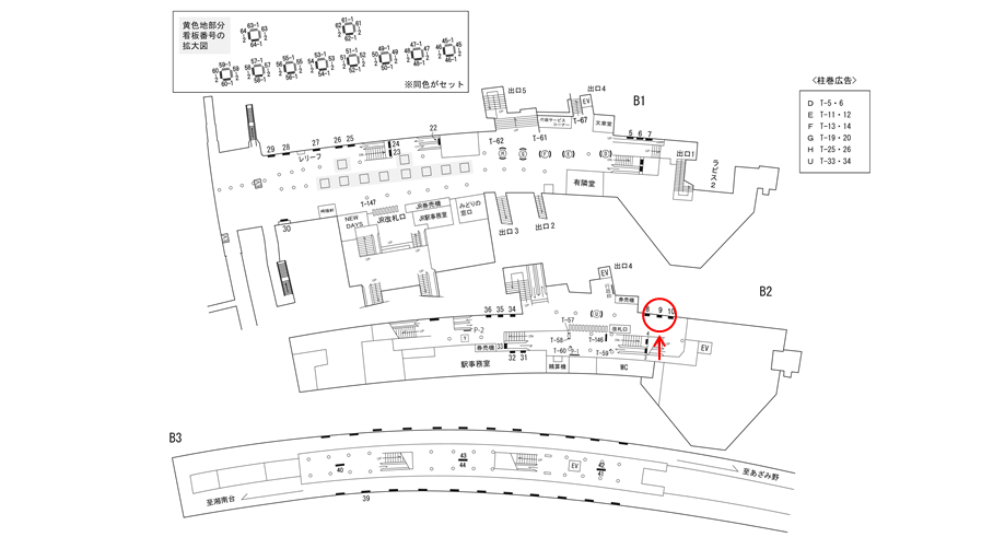 駅構内にある駅看板は「これから電車に乗る方」もしくは「駅を出る方」に見てもらえます。いずれにしても駅を利用するタイミングで広告に接触します。移動中に見てもらえる駅構内の駅看板は、戸塚駅の周辺にある店舗施設の紹介や道案内に利用されています。特に駅の出口付近にある駅看板は、店舗までの距離が近く案内看板に適しています。