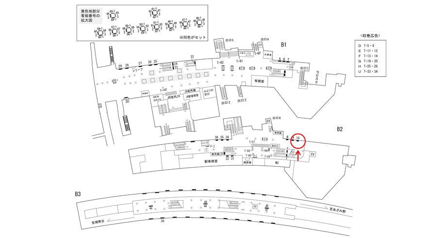 駅構内にある駅看板は「これから電車に乗る方」もしくは「駅を出る方」に見てもらえます。いずれにしても駅を利用するタイミングで広告に接触します。移動中に見てもらえる駅構内の駅看板は、戸塚駅の周辺にある店舗施設の紹介や道案内に利用されています。特に駅の出口付近にある駅看板は、店舗までの距離が近く案内看板に適しています。