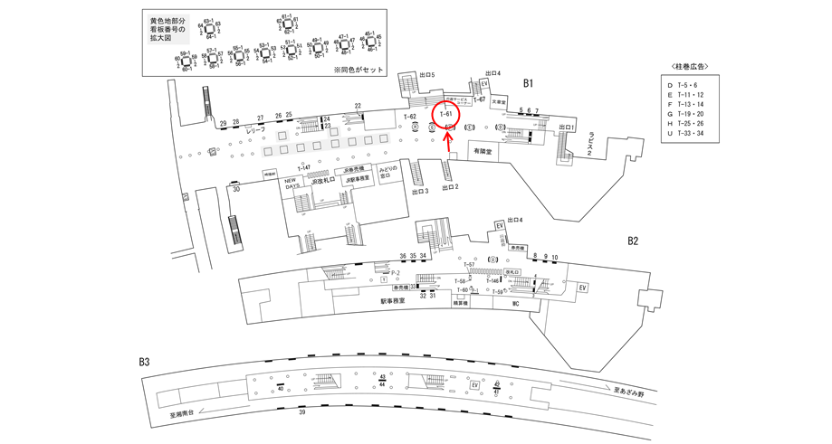 駅構内にある駅看板は「駅を出る方」に見てもらえます。移動中に見てもらえる駅構内の駅看板は、戸塚駅の周辺にある店舗施設の紹介や道案内に利用されています。特に駅の出口付近にある駅看板は、店舗までの距離が近く案内看板に適しています。