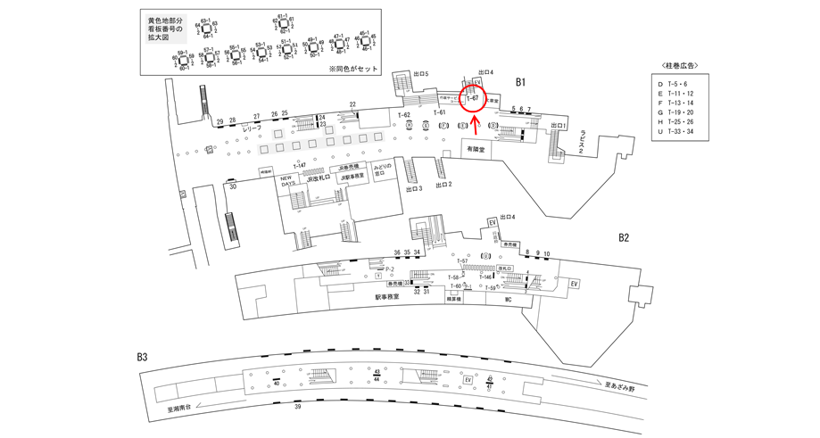 駅構内にある駅看板は「駅を出る方」に見てもらえます。移動中に見てもらえる駅構内の駅看板は、戸塚駅の周辺にある店舗施設の紹介や道案内に利用されています。特に駅の出口付近にある駅看板は、店舗までの距離が近く案内看板に適しています。