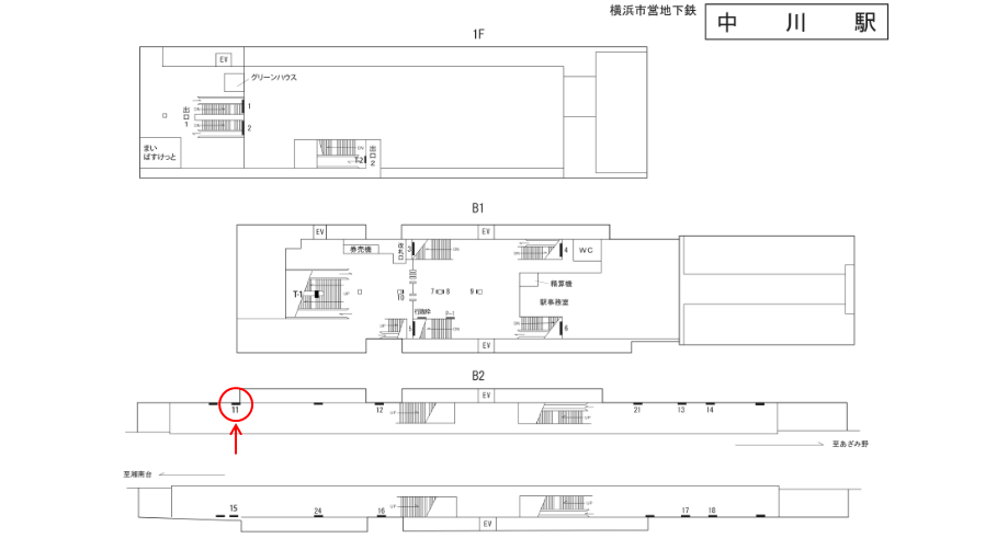 横浜市営地下鉄 中川駅のホームにある駅看板です。