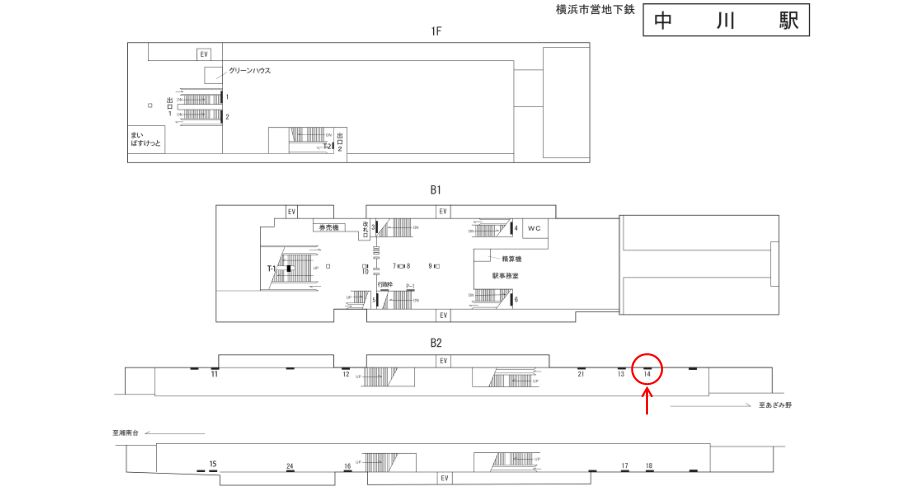 横浜市営地下鉄 中川駅のホームにある駅看板です。