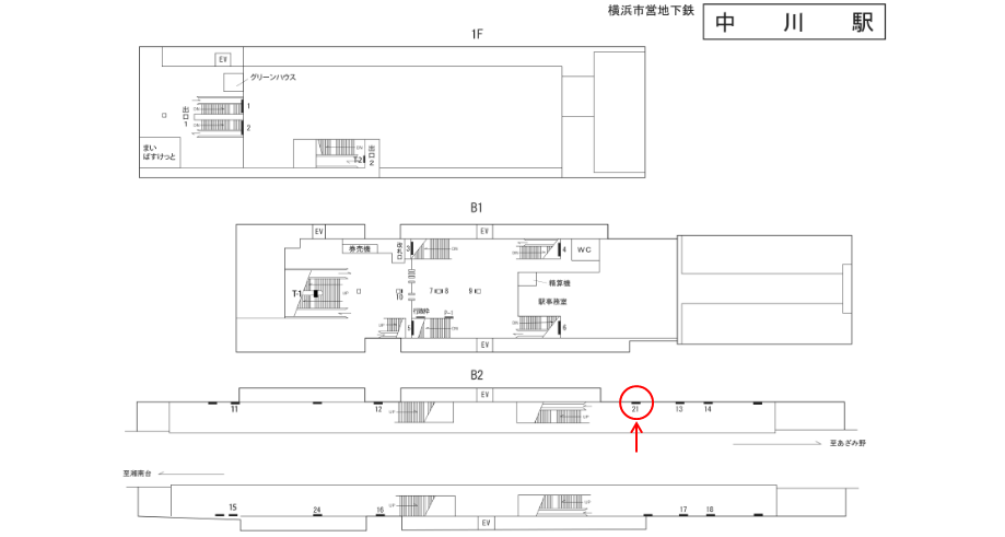 横浜市営地下鉄 中川駅のホームにある駅看板です。