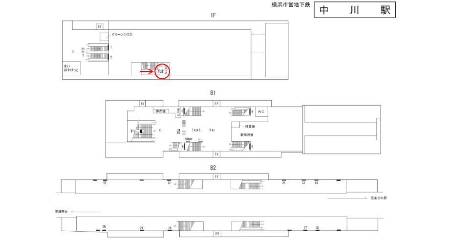 横浜市営地下鉄 中川駅の駅構内にある駅看板です。