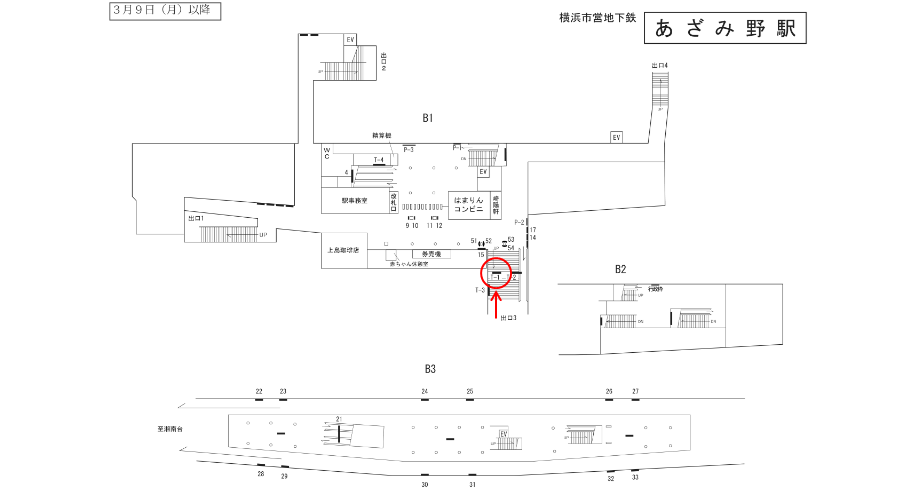 横浜市営地下鉄 あざみ野駅の階段の正面にある駅看板です。