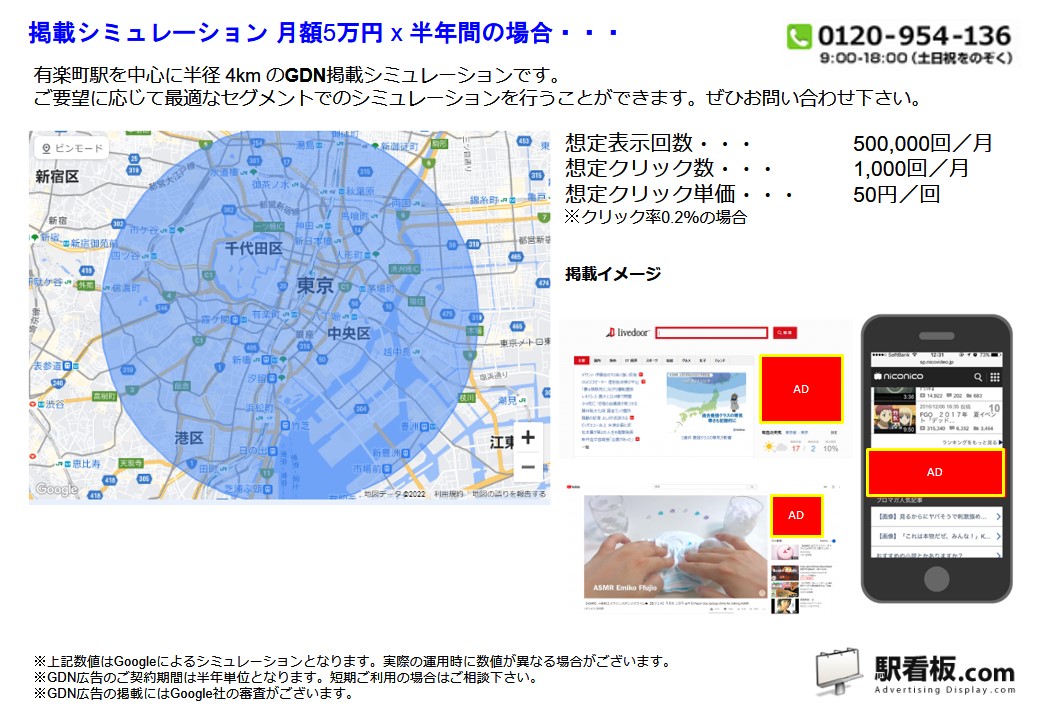 JR 有楽町駅 を中心に、ご指定の半径(km)を対象に、パソコンやスマートフォンを閲覧している方に向けて配信できるディスプレイ(バナー)広告です。Googleと提携しているサイトやアプリ または Yahoo!JAPANや提携サイトの広告枠に配信できるディスプレイ(バナー広告)で、駅利用者や電車利用者、指定半径内を移動している方や、勤務・居住している方に向けて企業や製品・サービスなどを訴求できます。