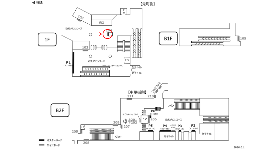 駅構内にある駅看板は「これから電車に乗る方」もしくは「駅を出る方」に見てもらえます。いずれにしても駅を利用するタイミングで広告に接触します。移動中に見てもらえる駅構内の駅看板は、元町・中華街駅の周辺にある店舗施設の紹介や道案内に利用されています。特に駅の出口付近にある駅看板は、店舗までの距離が近く案内看板に適しています。