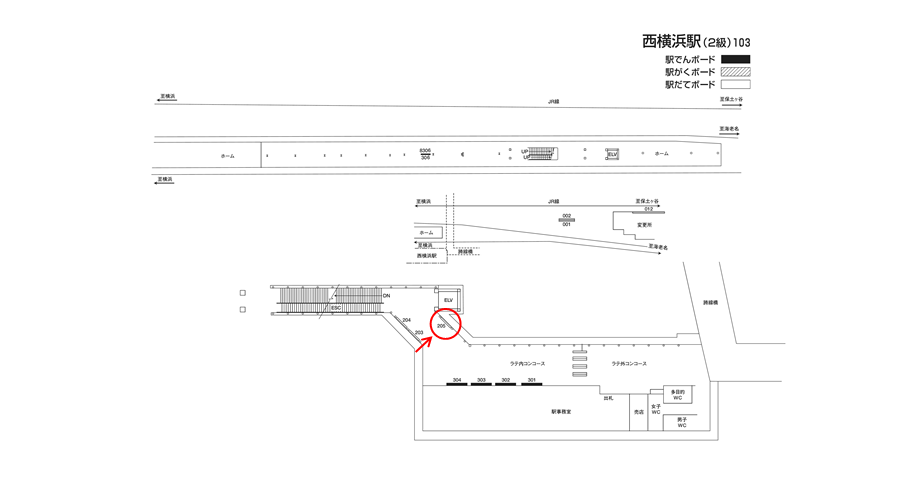 駅構内にある駅看板は「これから電車に乗る方」もしくは「駅を出る方」に見てもらえます。いずれにしても駅を利用するタイミングで広告に接触します。移動中に見てもらえる駅構内の駅看板は、西横浜駅の周辺にある店舗施設の紹介や道案内に利用されています。特に駅の出口付近にある駅看板は、店舗までの距離が近く案内看板に適しています。