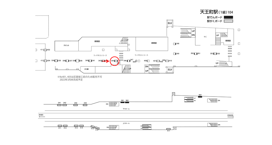 駅構内にある駅看板は「これから電車に乗る方」もしくは「駅を出る方」に見てもらえます。いずれにしても駅を利用するタイミングで広告に接触します。移動中に見てもらえる駅構内の駅看板は、天王町駅の周辺にある店舗施設の紹介や道案内に利用されています。特に駅の出口付近にある駅看板は、店舗までの距離が近く案内看板に適しています。