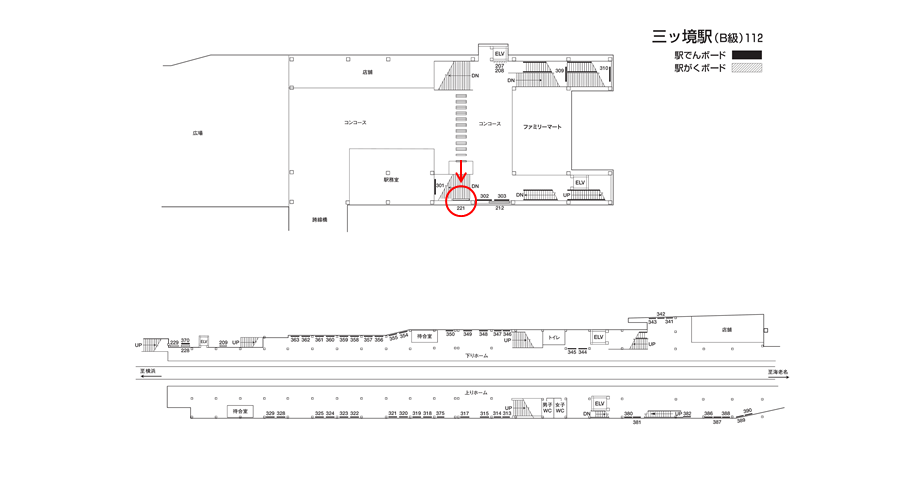 駅構内にある駅看板は「これから電車に乗る方」もしくは「駅を出る方」に見てもらえます。いずれにしても駅を利用するタイミングで広告に接触します。移動中に見てもらえる駅構内の駅看板は、三ツ境駅の周辺にある店舗施設の紹介や道案内に利用されています。特に駅の出口付近にある駅看板は、店舗までの距離が近く案内看板に適しています。