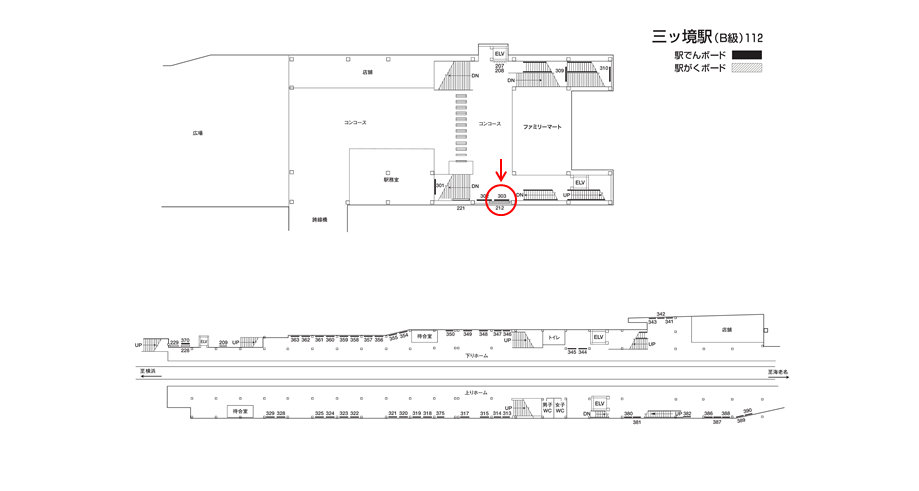 駅構内にある駅看板は「これから電車に乗る方」もしくは「駅を出る方」に見てもらえます。いずれにしても駅を利用するタイミングで広告に接触します。移動中に見てもらえる駅構内の駅看板は、三ツ境駅の周辺にある店舗施設の紹介や道案内に利用されています。特に駅の出口付近にある駅看板は、店舗までの距離が近く案内看板に適しています。