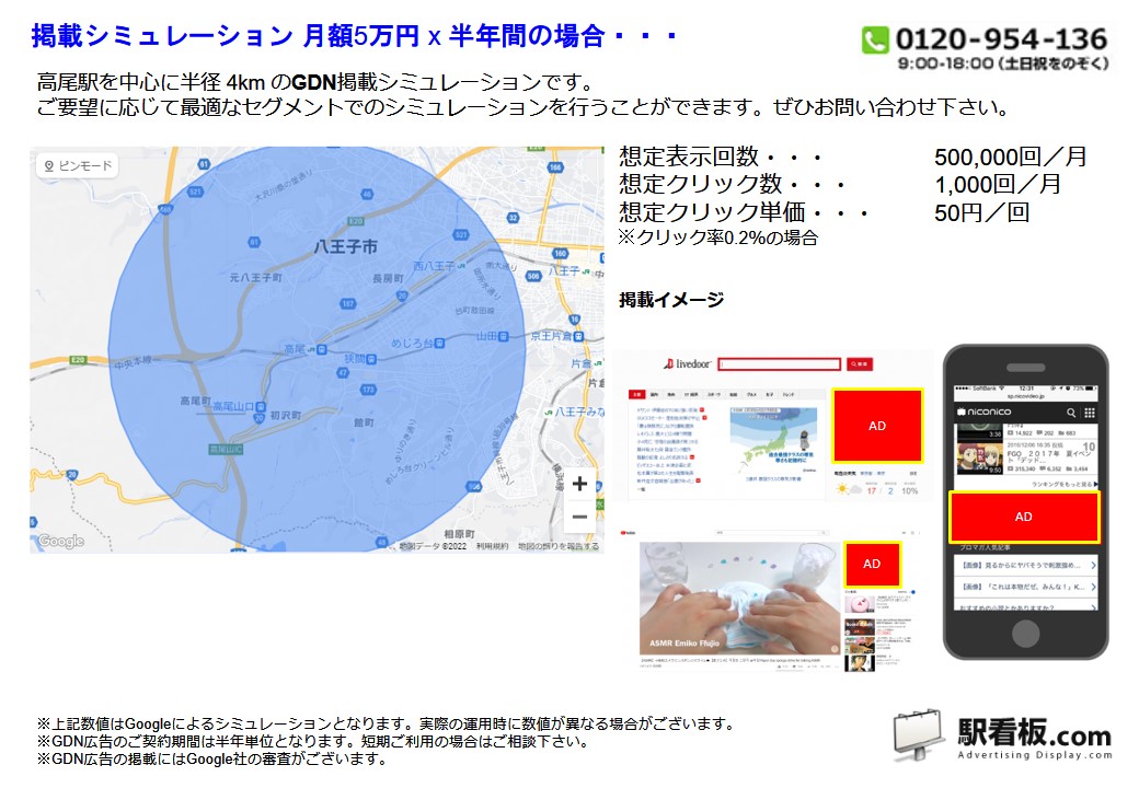 JR 高尾駅 を中心に、ご指定の半径(km)を対象に、パソコンやスマートフォンを閲覧している方に向けて配信できるディスプレイ(バナー)広告です。Googleと提携しているサイトやアプリ または Yahoo!JAPANや提携サイトの広告枠に配信できるディスプレイ(バナー広告)で、駅利用者や電車利用者、指定半径内を移動している方や、勤務・居住している方に向けて企業や製品・サービスなどを訴求できます。