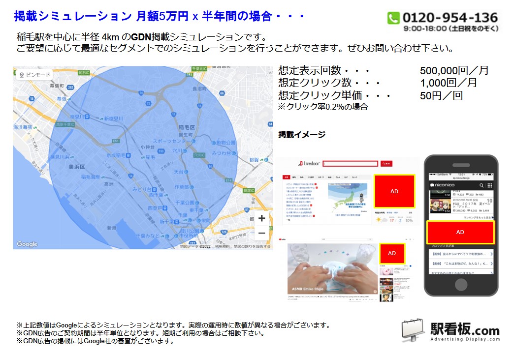 JR 稲毛駅 を中心に、ご指定の半径(km)を対象に、パソコンやスマートフォンを閲覧している方に向けて配信できるディスプレイ(バナー)広告です。Googleと提携しているサイトやアプリ または Yahoo!JAPANや提携サイトの広告枠に配信できるディスプレイ(バナー広告)で、駅利用者や電車利用者、指定半径内を移動している方や、勤務・居住している方に向けて企業や製品・サービスなどを訴求できます。