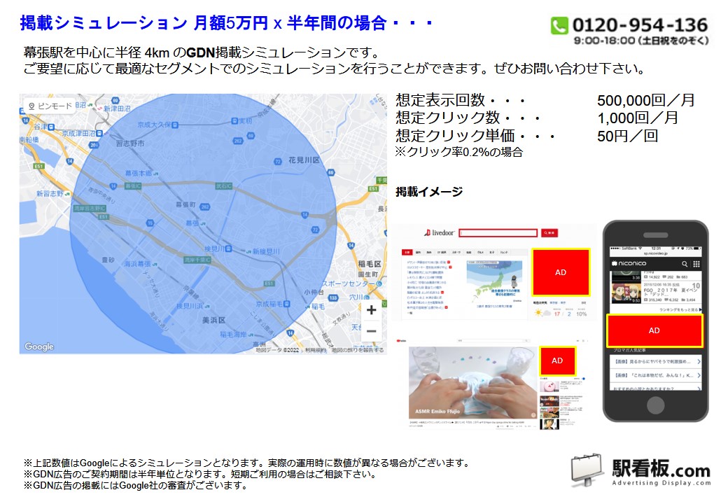 JR 幕張駅 を中心に、ご指定の半径(km)を対象に、パソコンやスマートフォンを閲覧している方に向けて配信できるディスプレイ(バナー)広告です。Googleと提携しているサイトやアプリ または Yahoo!JAPANや提携サイトの広告枠に配信できるディスプレイ(バナー広告)で、駅利用者や電車利用者、指定半径内を移動している方や、勤務・居住している方に向けて企業や製品・サービスなどを訴求できます。