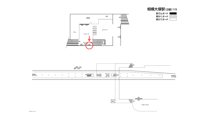 駅構内にある駅看板は「これから電車に乗る方」もしくは「駅を出る方」に見てもらえます。いずれにしても駅を利用するタイミングで広告に接触します。移動中に見てもらえる駅構内の駅看板は、相模大塚駅の周辺にある店舗施設の紹介や道案内に利用されています。特に駅の出口付近にある駅看板は、店舗までの距離が近く案内看板に適しています。