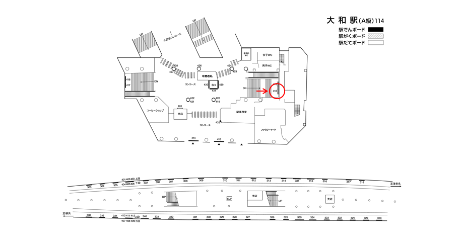こちらの駅看板は「これから電車に乗る方」に見てもらえます。階段付近は駅利用者が集中するエリアで目に留めてもらいやすい広告ロケーションです。サービス周知や企業広告などに適しており、日常的に駅を使う「大和駅に生活基盤をもつ消費者」を対象とした広告にオススメです。