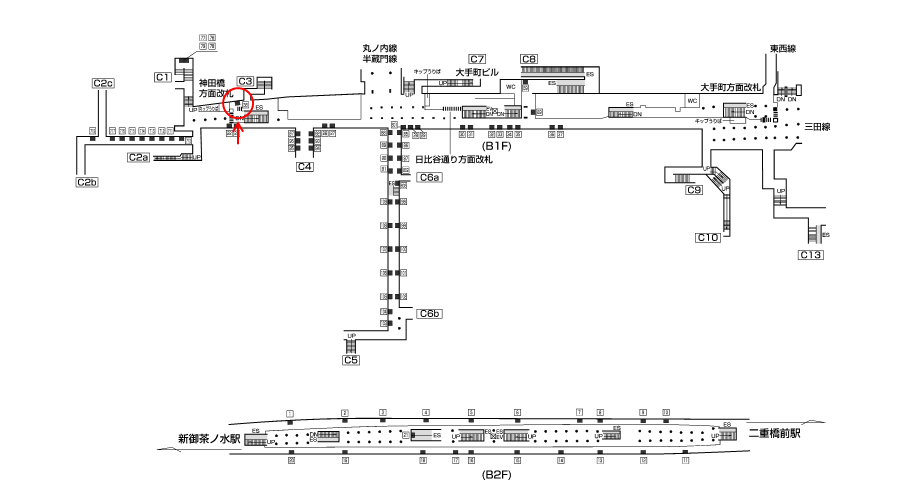 改札外通路(神田橋方面改札・C1~C2出口付近)