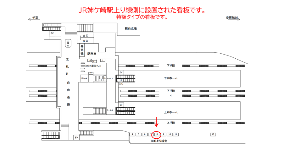 ホーム上長浦駅寄りに位置しており、主に上りホームで電車を待つ方に対して訴求可能な広告です。
