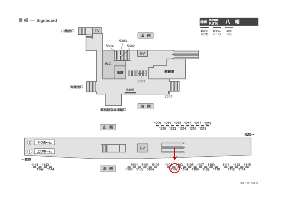 京成本線 八幡駅の上りホーム(京成高砂・青砥・上野方面)の線路前の看板です。ホームで電車を待つ際に見えます。