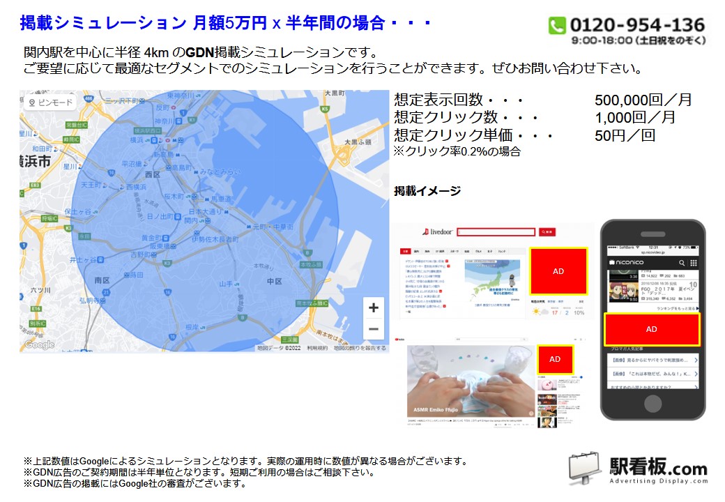 JR 関内駅 を中心に、ご指定の半径(km)を対象に、パソコンやスマートフォンを閲覧している方に向けて配信できるディスプレイ(バナー)広告です。Googleと提携しているサイトやアプリ または Yahoo!JAPANや提携サイトの広告枠に配信できるディスプレイ(バナー広告)で、駅利用者や電車利用者、指定半径内を移動している方や、勤務・居住している方に向けて企業や製品・サービスなどを訴求できます。