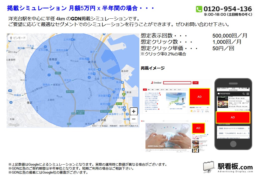 JR 洋光台駅 を中心に、ご指定の半径(km)を対象に、パソコンやスマートフォンを閲覧している方に向けて配信できるディスプレイ(バナー)広告です。Googleと提携しているサイトやアプリ または Yahoo!JAPANや提携サイトの広告枠に配信できるディスプレイ(バナー広告)で、駅利用者や電車利用者、指定半径内を移動している方や、勤務・居住している方に向けて企業や製品・サービスなどを訴求できます。