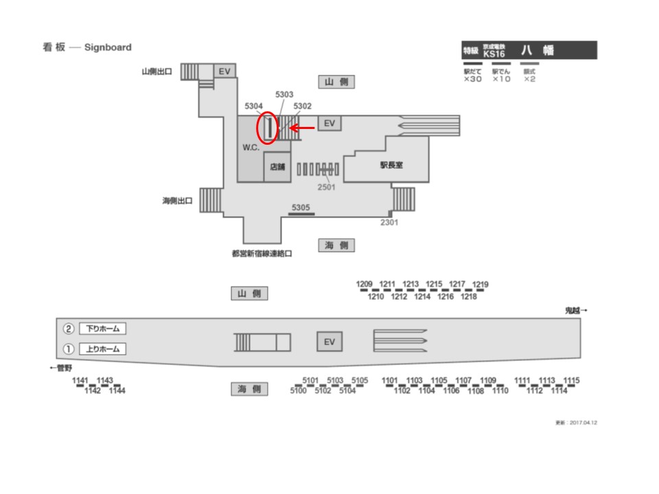 京成本線 八幡駅の上りホーム(京成高砂・青砥・上野方面)の線路前の看板です。ホームで電車を待つ際に見えます。こちらはホーム階段付近に設置されております。