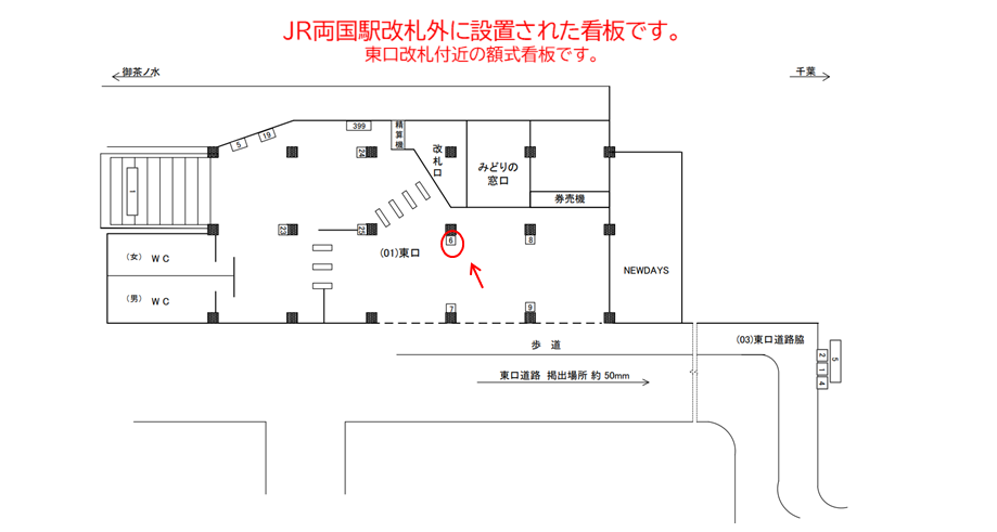 JR総武線 両国駅、東口改札外の柱にある看板です。