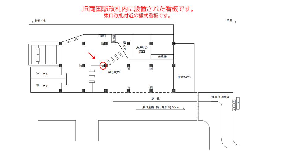 JR総武線 両国駅、東口改札内の柱にある看板です。