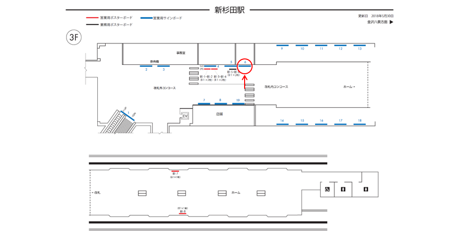 移動中に見てもらえる駅構内の駅看板は、新杉田駅の周辺にある店舗施設の紹介や道案内に利用されています。