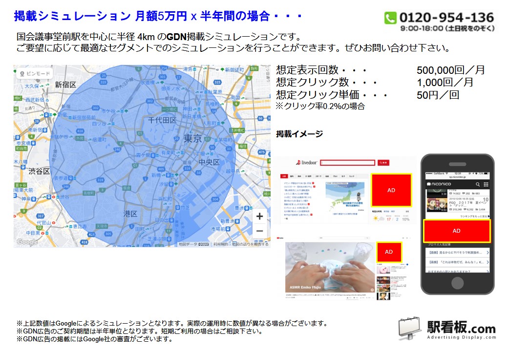 東京メトロ 国会議事堂前駅 を中心に、ご指定の半径(km)を対象に、パソコンやスマートフォンを閲覧している方に向けて配信できるディスプレイ(バナー)広告です。Googleと提携しているサイトやアプリ または Yahoo!JAPANや提携サイトの広告枠に配信できるディスプレイ(バナー広告)で、駅利用者や電車利用者、指定半径内を移動している方や、勤務・居住している方に向けて企業や製品・サービスなどを訴求できます。