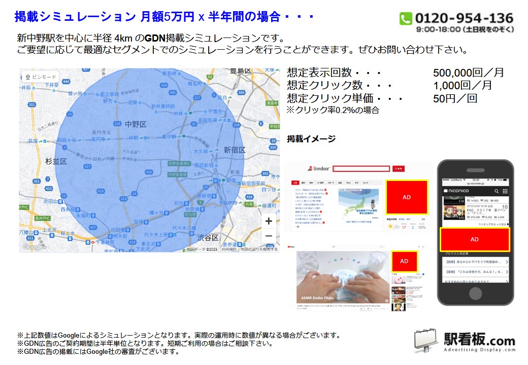 東京メトロ 新中野駅 を中心に、ご指定の半径(km)を対象に、パソコンやスマートフォンを閲覧している方に向けて配信できるディスプレイ(バナー)広告です。Googleと提携しているサイトやアプリ または Yahoo!JAPANや提携サイトの広告枠に配信できるディスプレイ(バナー広告)で、駅利用者や電車利用者、指定半径内を移動している方や、勤務・居住している方に向けて企業や製品・サービスなどを訴求できます。