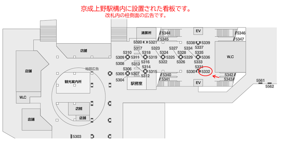 改札内の柱側面に設置された№5332の看板は、1.2番ホームに停車した車両から改札階へ上がってきた直後に広告との接触が期待できます。