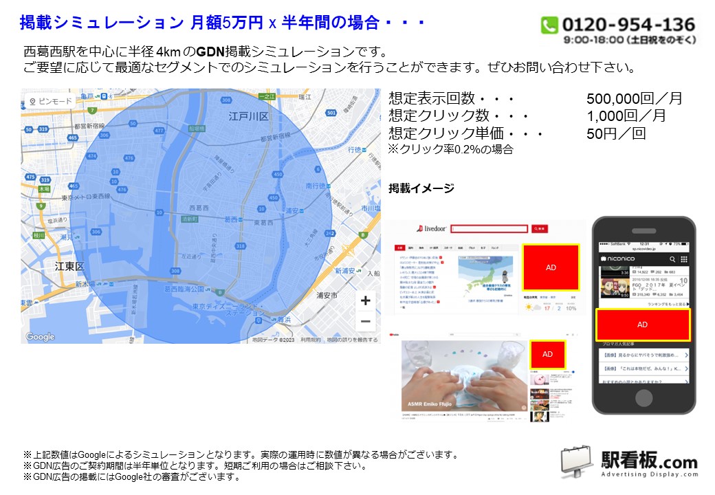 東京メトロ 西葛西駅 を中心に、ご指定の半径(km)を対象に、パソコンやスマートフォンを閲覧している方に向けて配信できるディスプレイ(バナー)広告です。Googleと提携しているサイトやアプリ または Yahoo!JAPANや提携サイトの広告枠に配信できるディスプレイ(バナー広告)で、駅利用者や電車利用者、指定半径内を移動している方や、勤務・居住している方に向けて企業や製品・サービスなどを訴求できます。