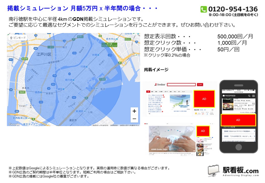 東京メトロ 南行徳駅 を中心に、ご指定の半径(km)を対象に、パソコンやスマートフォンを閲覧している方に向けて配信できるディスプレイ(バナー)広告です。Googleと提携しているサイトやアプリ または Yahoo!JAPANや提携サイトの広告枠に配信できるディスプレイ(バナー広告)で、駅利用者や電車利用者、指定半径内を移動している方や、勤務・居住している方に向けて企業や製品・サービスなどを訴求できます。