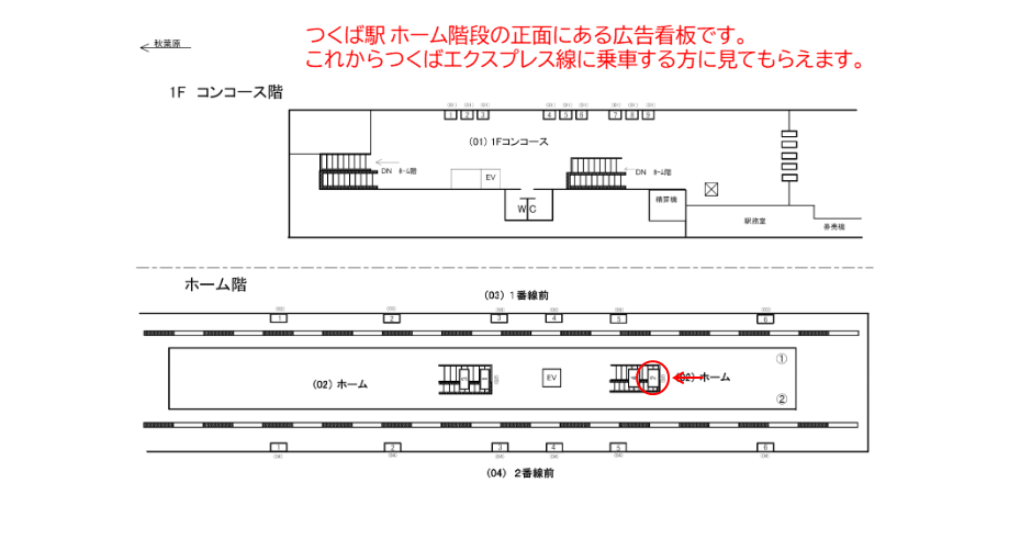 つくば駅はつくばエクスプレス線の始発駅です。つくば駅から秋葉原行の電車を利用する方を対象とした広告です。