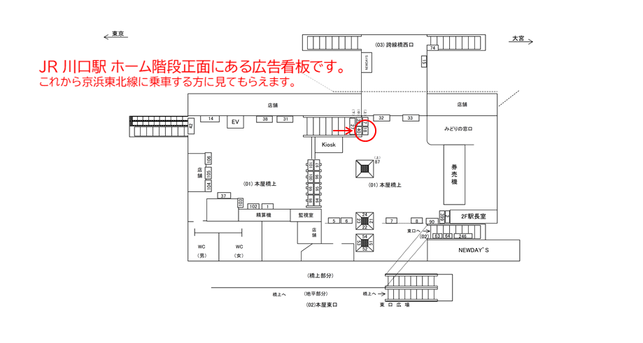 JR 川口駅、改札内コンコースに設置されている駅広告(駅看板)のご紹介です。京浜東北線ホームに下りる階段そばにあります。この駅看板はこれから電車に乗る方の視界に入りやすい場所にあります。川口エリアの通勤通学者を始めとした駅利用者への広告としてご利用ください。