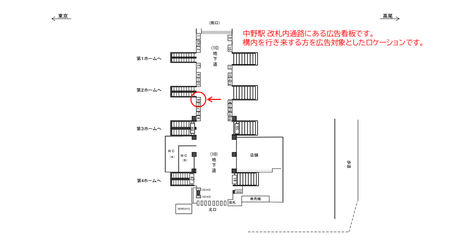 中央線と東西線の乗り継ぎで中野駅構内を移動する方にも見てもらえる広告ロケーションです。