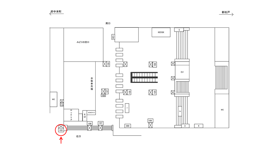 武蔵野線のプラットホームの中でも№122はホーム中央付近にあります。