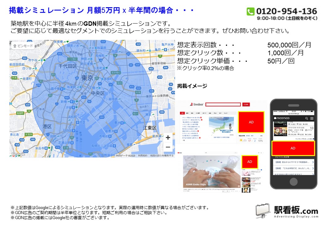 東京メトロ 築地駅 を中心に、ご指定の半径(km)を対象に、パソコンやスマートフォンを閲覧している方に向けて配信できるディスプレイ(バナー)広告です。Googleと提携しているサイトやアプリ または Yahoo!JAPANや提携サイトの広告枠に配信できるディスプレイ(バナー広告)で、駅利用者や電車利用者、指定半径内を移動している方や、勤務・居住している方に向けて企業や製品・サービスなどを訴求できます。