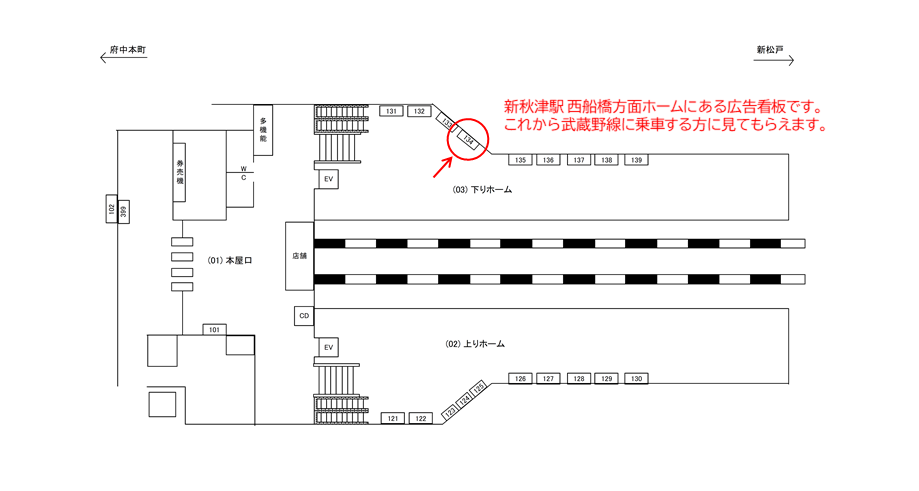 新秋津駅の利用者は、乗り換えのために駅構内で過ごす時間が比較的長くなることがあり、こうした特性を活かした広告展開やサービスの発信にも適した環境となっています。