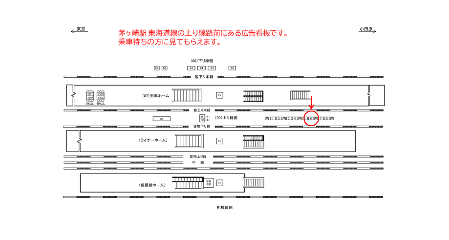 東海道線ホームにある広告看板です。ホームで乗車を待つ方に見てもらえます。ホーム看板は待ち時間を利用した広告宣伝が行なえます。そのため視界に入る時間が長く、内容を読み込んでもらうのに適した広告ロケーションです。